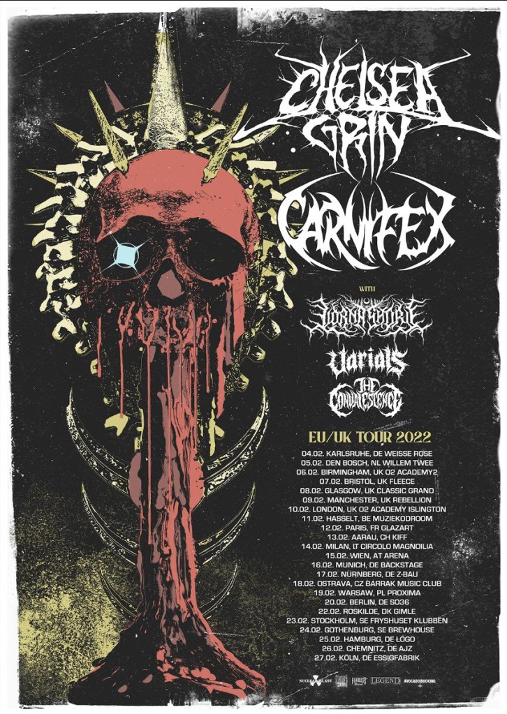 A thunderstorm of extreme metal will be rolling over Europe in February 2022! Californian deathcore outfit CARNIFEX teams up with CHELSEA GRIN to tear apart venues all over the continent. Starting in Karlsruhe on February 4th, the squad will travel 23 cities bringing heavy neckbreakers and massive breakdowns to the people – together with their high class support bands LORNA SHORE, VARIALS and THE CONVALESCENCE.