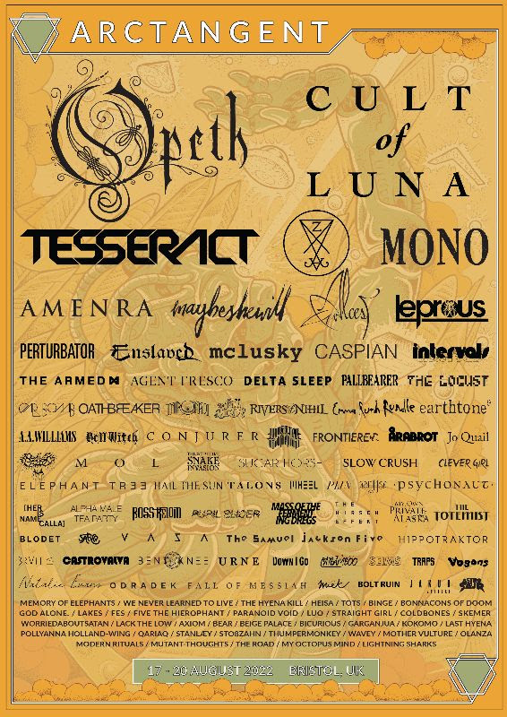 Opeth / Cult of Luna / TesseracT / Zeal & Ardor / MONO / Amenra / Maybeshewill / Alcest / Leprous / Perturbator / Enslaved / Mclusky / Caspian / Intervals / The Armed / Agent Fresco / Delta Sleep / Pallbearer / The Locust / Oathbreaker / Intronaut / The Fall of Troy / Rivers of Nihil / Emma Ruth Rundle / Earthtone9 / A.A.Williams / Bell Witch / Conjurer / IMPERIAL TRIUMPHANT / Frontierer / Arabrot / Jo Quail / Oranssi Pazuzu / MØL / The St. Pierre Snake Invasion / Sugar Horse / Car Bomb / Slow Crush / Clever Girl / Elephant Tree / Hail The Sun / Talons / Wheel / Pijn / Psychonaut / Her Name Is Calla / Alpha Male Tea Party / Boss Keloid / Pupil Slicer / Mass of the Fermenting Dregs / The Hirsch Effekt / My Own Private Alaska / The Totemist / Blodet / Satyr / Fall of Messiah / The Samuel Jackson Five / Memory of Elephants / Hippotraktor / BRUIT ≤ / Castrovalva / Bent Knee / URNE / Down I Go / Catbamboo / SEIMS / Traps / Vogons / Natalie Evans / Odradek / VASA / MIËT / Bolt Ruin / Jakub Zytecki / Astrosaur / We Never Learned To Live / The Hyena Kill / Heisa / TOTS / Binge / FES / Lakes / Bonnacons of Doom / Five The Hierophant / Paranoid Void / Luo / God Alone. / Straight Girl / Coldbones / Lack The Low / worriedaboutsatan / Skemer / Axiom / Bear / Beige Palace / Bicurious / Garganjua / Kokomo / Last Hyena / Pollyanna Holland-Wing / qariaq / STANLÆY / Stoßzahn / Thumpermonkey / Wavey / Mother Vulture / Modern Rituals / Mutant-Thoughts / Olanza / The Road / My Octopus Mind / Lightning Sharks