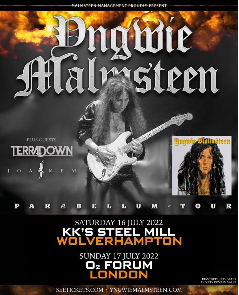 Yngwie Malmsteen has rescheduled his two UK headline shows in support of new album PARABELLUM. They will now take place in July 2022 and will see Yngwie take to the stage at Wolverhampton’s KK’s Steel Mill (16 July) and London’s prestigious O2 Forum Kentish Town (17 July) marking 5 years since his last capital performance. Support for the two dates comes from Dutch metal outfit TerraDown, and Cypriot progressive-rocker Joakem.