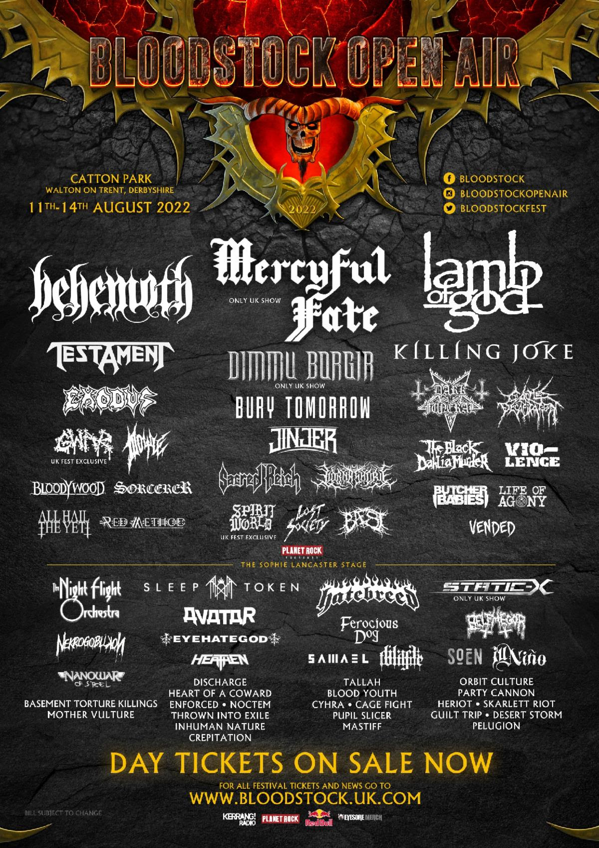 BLOODSTOCK’s 2022 Ronnie James Dio main stage headliners are BEHEMOTH, LAMB OF GOD, and MERCYFUL FATE. Also appearing across the weekend are KILLING JOKE, DIMMU BORGIR, TESTAMENT, EXODUS, AVATAR, ALL HAIL THE YETI, BLACK DAHLIA MURDER, GWAR (in a UK festival exclusive), BURY TOMORROW, SACRED REICH, LIFE OF AGONY, SPIRITWORLD, BELPHEGOR, BUTCHER BABIES, VIO-LENCE, BLOODYWOOD, JINJER, LORNA SHORE, DOYLE, LOST SOCIETY, HATEBREED, SLEEP TOKEN, DARK FUNERAL, EYEHATEGOD, DISCHARGE, STATIC-X, THE NIGHT FLIGHT ORCHESTRA, ENFORCED, PARTY CANNON, SOEN, HERIOT, BLOOD YOUTH, BLACK TONGUE, HEART OF A COWARD, FEROCIOUS DOG, HEATHEN, NEKROGOBLIKON, CATTLE DECAPITATION, ORBIT CULTURE, TALLAH, SAMAEL, CYHRA, NOCTEM, NANOWAR OF STEEL, THROWN INTO EXILE, PUPIL SLICER, CAGE FIGHT, VENDED, ILL NINO, SKARLETT RIOT, DESERT STORM, SORCERER, RED METHOD, and BAEST as well as many more yet to come. Stay tuned for additional 2022 announcements in due course.