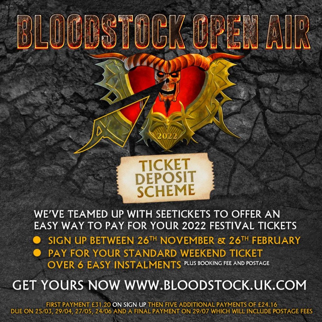 Lastly, it’s final call for BLOODSTOCK’s phenomenally popular weekend ticket Deposit Scheme. Sign up here before 11.59pm this Saturday night, 26th Feb, if you want to take advantage. This year, payments are spread across 6 months instead of 5, making it even more manageable to secure your place and pay for your ticket in instalments. An initial payment of £31.20 is due upon sign up, then five additional payments of £24.16 will debit your bank account on 25 Mar, 29 Apr, 27 May, 24 Jun, with a final instalment on 29 Jul, which will include any applicable admin/booking fees. Tickets will be delivered digitally.