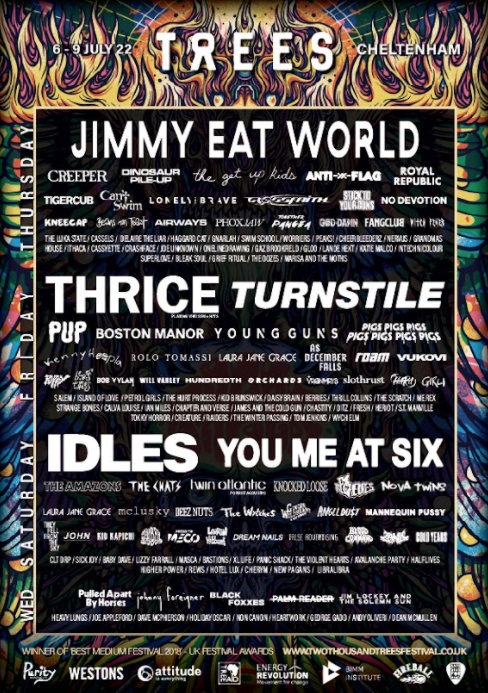 Jimmy Eat World / Creeper / Dinosaur Pile-Up / The Get Up Kids / Anti-Flag / Nova Twins / Royal Republic / Can’t Swim / Lonely The Brave / Crossfaith / Stick To Your Guns / No Devotion / Kneecap / Beans On Toast / Airways / Phoxjaw / Together Pangea / God Damn / Fangclub / The Luka State / Cassels / Witch Fever / Delaire The Liar / Haggard Cat / Gnarlah / Swim School / Worriers / Nervus / Grandmas House / Cold Years / Cassyette / Crashface / joe unknown / onelinedrawing / Gaz Brookfield / Gloo / Lande Hekt / Katie Malco / InTechnicolour / Superlove / Bleak Soul / Grief Ritual / The Oozes / Marisa And The Moths