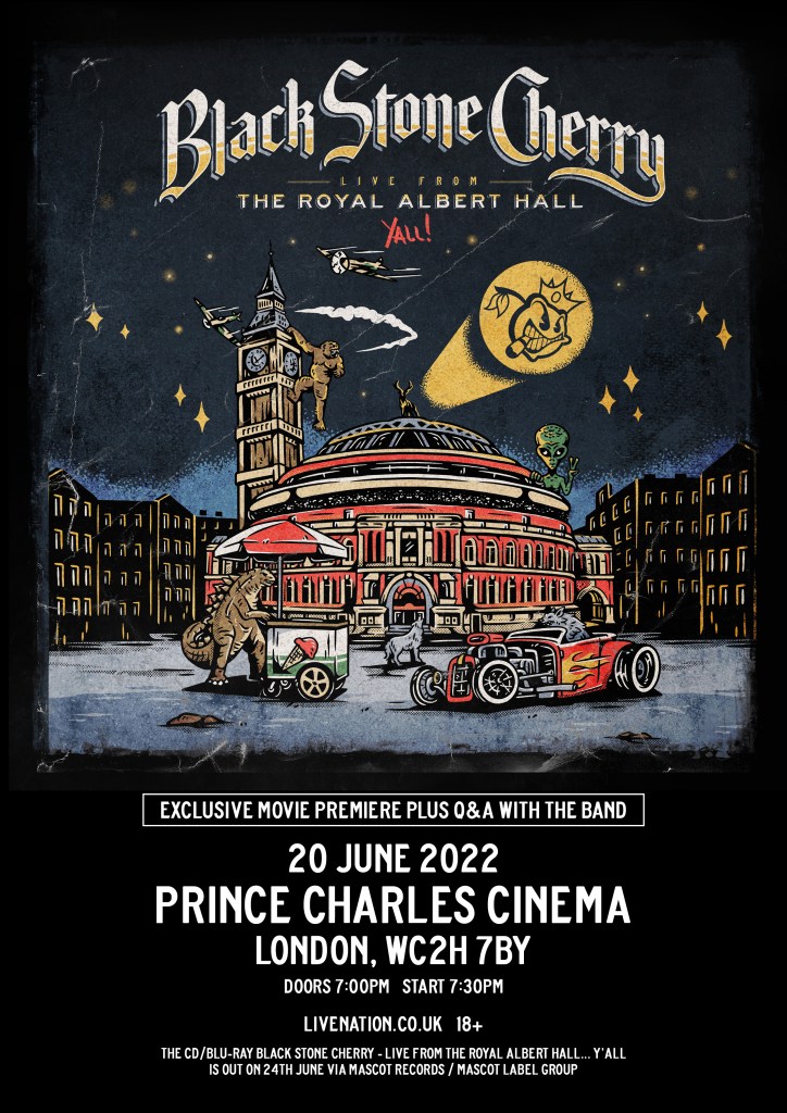 BLACK STONE CHERRY are excited to announce a very special London event to mark the arrival of their forthcoming ‘Live From The Royal Albert Hall… Y’All’ release, which is set to land via Mascot Label Group on Friday 24th June. A concert film and documentary of the Kentucky band’s triumphant show at the iconic London venue is set to premiere at the Prince Charles Cinema, Leicester Square, W1 on Monday 20th June, with the band in attendance. Frontman/guitarist Chris Robertson, guitarist Ben Wells, drummer John Fred Young and new bassist Steve Jewell will be participating in a fan Q&A, together with movie director, Mike Rodway, directly following the screening.