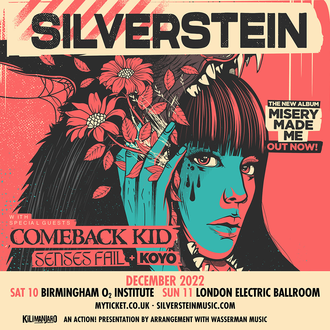 “People of the United Kingdom! We are super excited to be FINALLY coming back to headline two shows in your country! We’ll be playing a career-spanning set, with everything from our early days right up to our new album Misery Made Me. We are bringing some incredible support bands – our friends in Comeback Kid, Senses Fail and Koyo – truly an awesome lineup to make for such a beautiful night. Can’t wait to see you all there in London and Birmingham!”