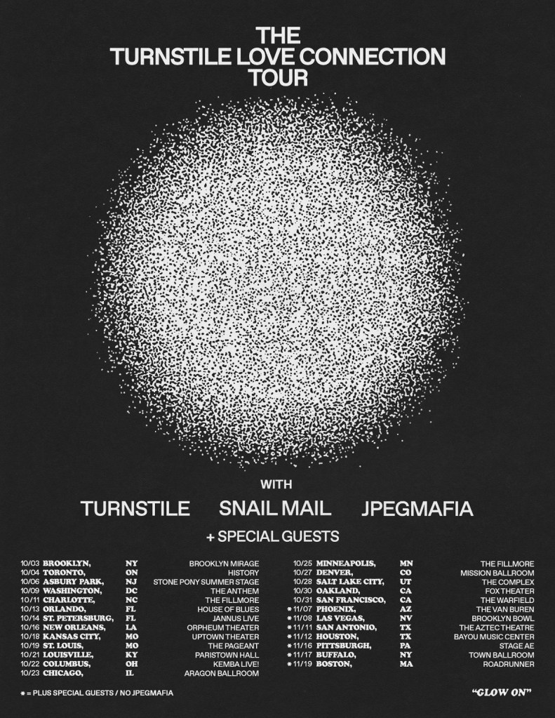 TURNSTILE have announced a fall headline tour of North America which will see the Baltimore band continuing their wildly successful “TURNSTILE LOVE CONNECTION TOUR” alongside special guests and hometown acts Snail Mail and JPEGMAFIA. The upcoming tour kicks off on October 3rd at NYC’s Brooklyn Mirage and includes stops in Asbury Park, Orlando, St. Louis, Louisville, Chicago and more [tour itinerary below]. Pre-sale tickets for the tour will be available starting tomorrow, June 22nd at 10:00AM local time with general on-sale for tickets beginning Thursday, June 23rd at 10:00AM local time. For tickets and more information on TURNSTILE’s fall tour and upcoming international dates, visit www.turnstilehardcore.com.