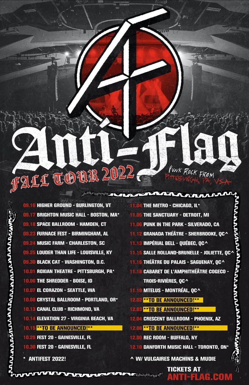 Anti-Flag’s tour will kick off on September 16 in Burlington, Vermont and run through November 6 with an appearance at Punk Rock in the Park in Silverado, California. The band will also head to Quebec for a trek with Vulgaires Machins and Mudie in November.