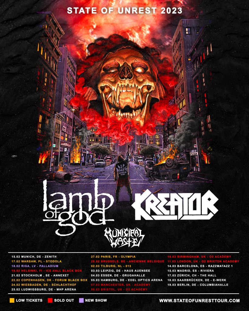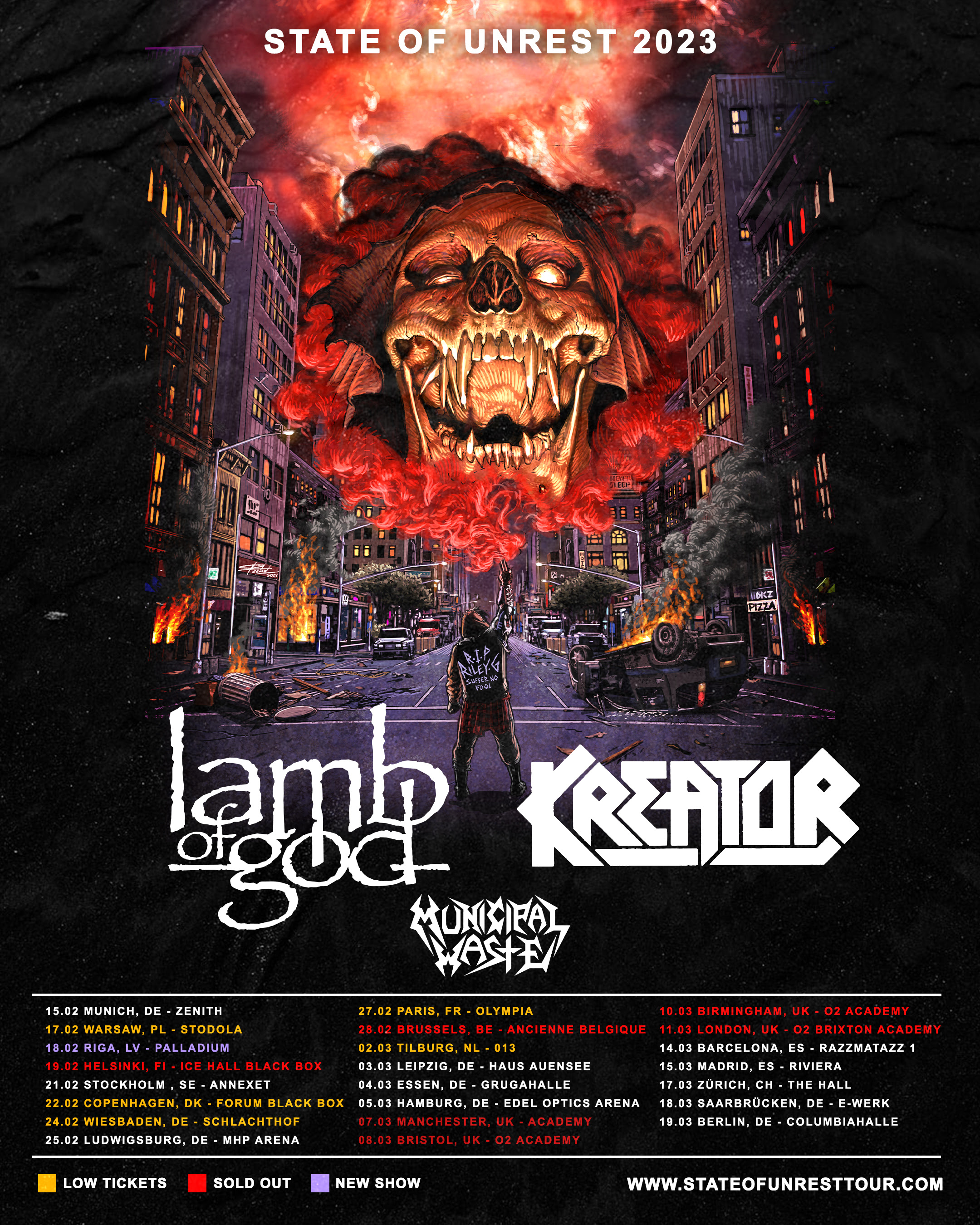 KREATOR and LAMB OF GOD have announced their label mates MUNICIPAL WASTE as support on their State Of Unrest 2023 European co-headline tour. The run was originally due to take place in Autumn 2022, but was recently postponed until February and March 2023. Acclaimed cross-over thrashers and notorious party animals MUNICIPAL WASTE from Richmond, Virginia, are known for their wild and highly energetic live shows, which makes them a perfect fit.Scroll down for a complete list of the State Of Unrest 2023 tour dates!Tickets are on sale now.