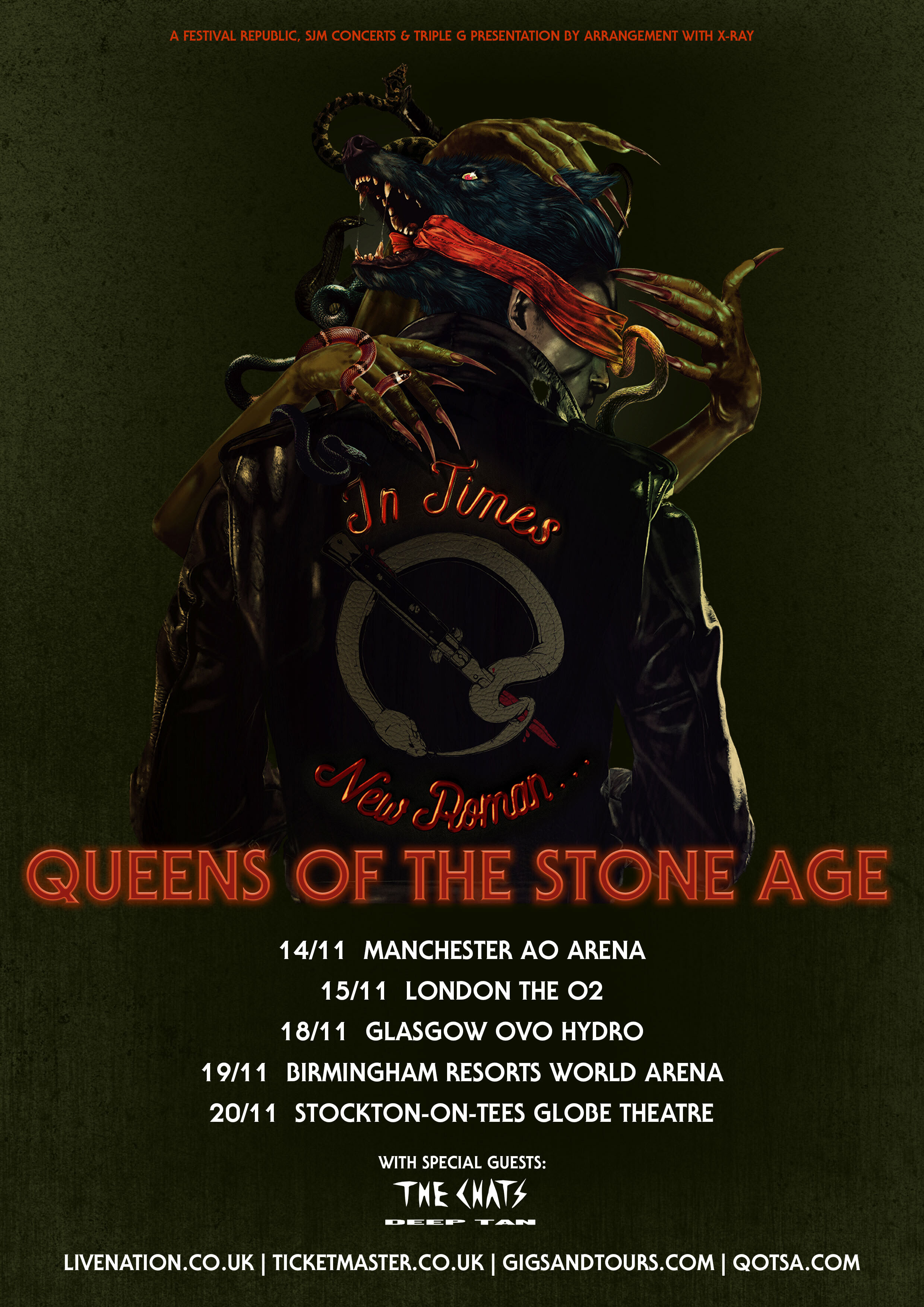 Ahead of their eagerly anticipated headline show on Glastonbury’s Other Stage (Sunday 25th June) and sold-out UK shows, Queens Of The Stone Age have today announced the details of their ‘The End Is Nero’ UK and European Arena tour. The Autumn dates will kick off on 4th November at Amsterdam’s Ziggo Dome before getting to the UK on 14th November at Manchester AO Arena and London’s The O2 on 15th November. The End Is Nero tour ends on 22nd November at Dublin’s 3Arena. Queens of The Stone Age Fan Pre-sale starts today at 10am BST / 11am CEST with public on-sale following Friday 16th June, 10am local time. Main support on all dates comes from The Chats and deep tan.