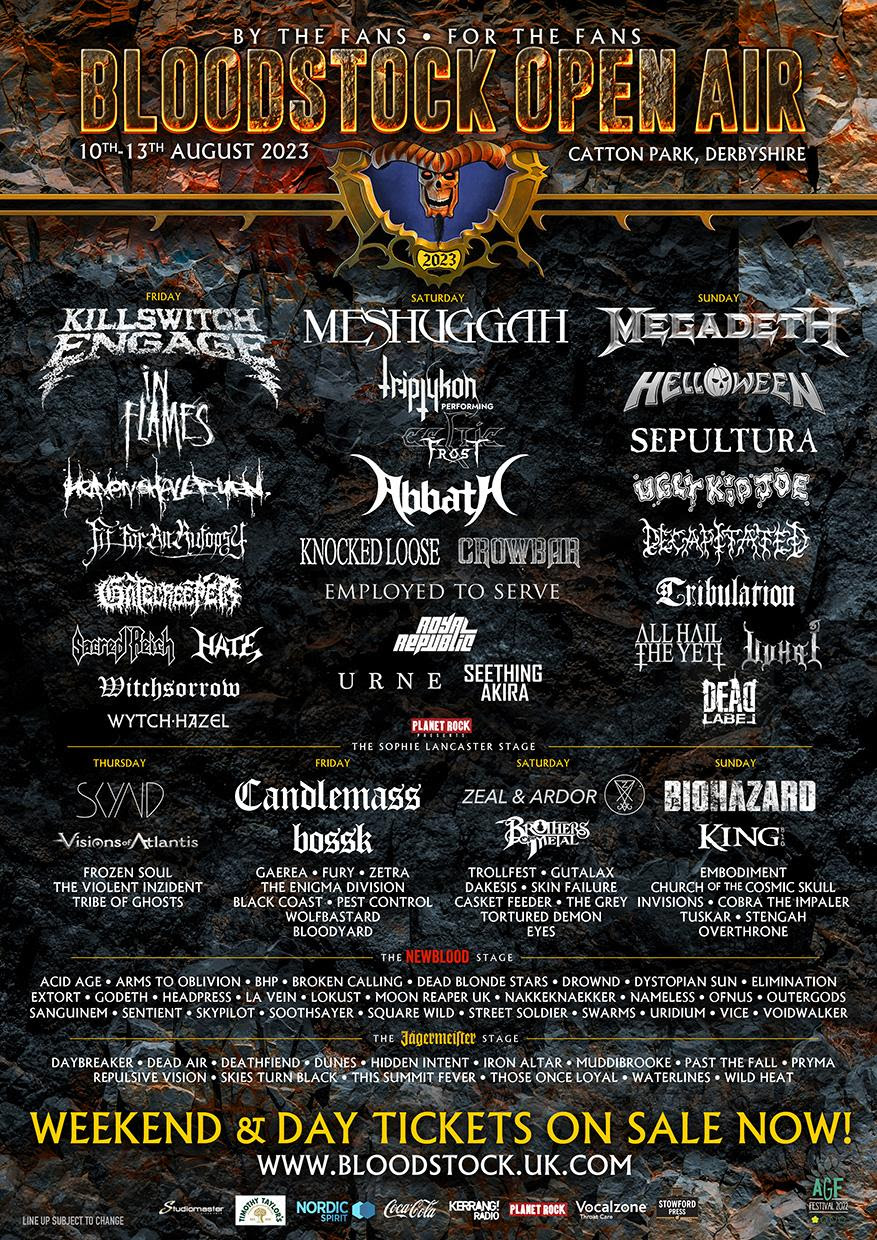 BLOODSTOCK’s 2023 Ronnie James Dio main stage headliners are KILLSWITCH ENGAGE, MESHUGGAH, and MEGADETH. Also appearing are HELLOWEEN, IN FLAMES, TRIPTYKON (PERFORMING CELTIC FROST), BIOHAZARD, EMPLOYED TO SERVE, ROYAL REPUBLIC, SACRED REICH, HEAVEN SHALL BURN, SEPULTURA, ABBATH, FIT FOR AN AUTOPSY, CROWBAR, CANDLEMASS, BOSSK, TRIBULATION, SEETHING AKIRA, UGLY KID JOE, DECAPITATED, GATECREEPER, ZEAL & ARDOR, KING 810, URNE, ALL HAIL THE YETI, DEAD LABEL, CHURCH OF THE COSMIC SKULL, BROTHERS OF METAL, GUTALAX, UUHAI, INVISIONS, COBRA THE IMPALER, TROLLFEST, SKYND, WARKINGS, FROZEN SOUL, THE VIOLENT INZIDENT, TRIBE OF GHOSTS, DAKESIS, THE ENIGMA DIVISION, THE GREY, EYES, TUSKAR, STENGAH, OVERTHRONE, TORTURED DEMON, CASKET FEEDER, PEST CONTROL, GAEREA, BLOODYARD, WOLFBASTARD, SKIN FAILURE, WITCHSORROW, WYTCH HAZEL, HATE, BLACK COAST, ZETRA and more. Stay tuned for more announcements to come!