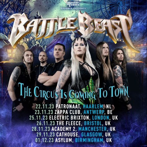 BATTLE BEAST are pleased to announce that the circus is returning to town! This winter the band will be returning to our stages for an extensive UK tour, hitting the cities of London, Bristol, Manchester, Glasgow and Birmingham. As well as two mainland EU shows in the Netherlands and Belgium.