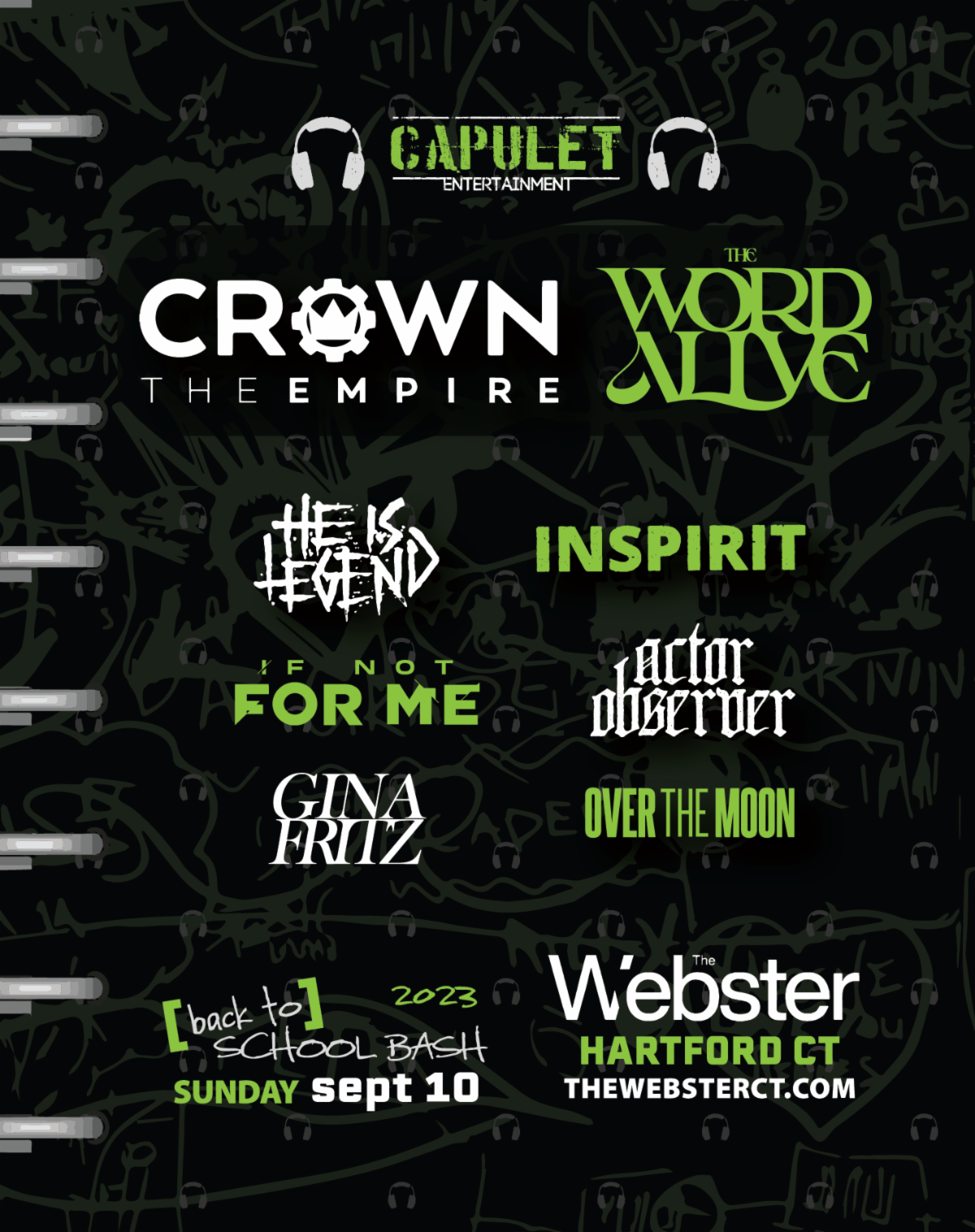 Capulet Entertainment’s Back to School Bash returns on Sunday September 10, 2023 this time bringing an epic lineup to The Webster Theater in Hartford, Connecticut. Last year, Capulet brought in the likes of Alesana, A Skylit Drive, Scarlett O’Hara and Convictions respectively, but this year takes it up a notch, or seven…bringing in a co-headlining bill that features Crown the Empire and The Word Alive. Also along to join in the fun are literal rock legends He is Legend, Inspirit (formerly known as Vanna), If Not For Me, Actor/Observer, CT’s own Gina Fritz, and Over the Moon.