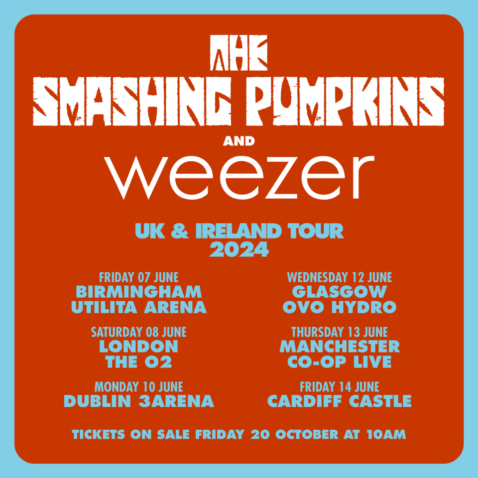 The Smashing Pumpkins and Weezer tour follows their headline stints at BeachLife festival in California last year. Tickets for the UK and Ireland 2024 tour go on sale Friday 20th October at 10am via www.gigsandtours.com and www.ticketmaster.co.uk. For Ireland, tickets will be available at www.ticketmaster.ie