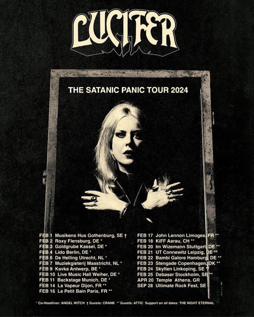 LUCIFER also recently announced a mainland European tour, titled the Satanic Panic tour, with Angel Witch, Attic, The Night Eternal and Crank. The tour poster can be found at the bottom of this mail.