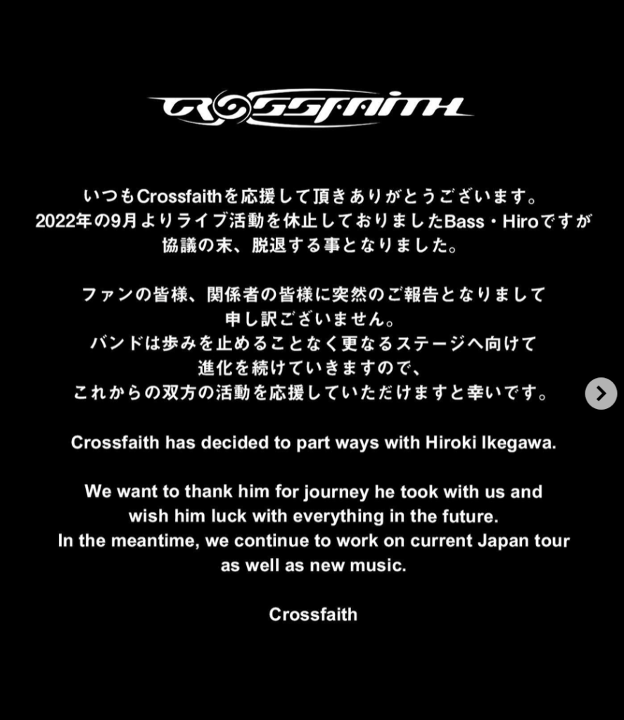 Crossfaith have decided to part ways with bassist Hiroki Ikegawa.
