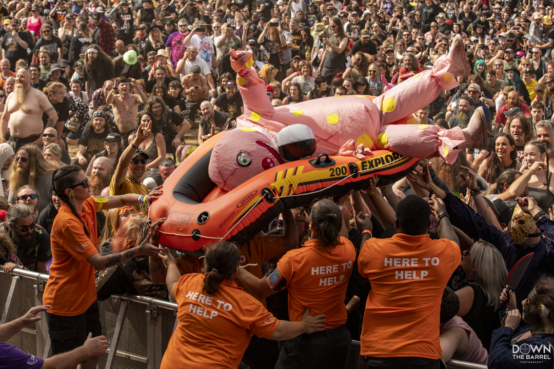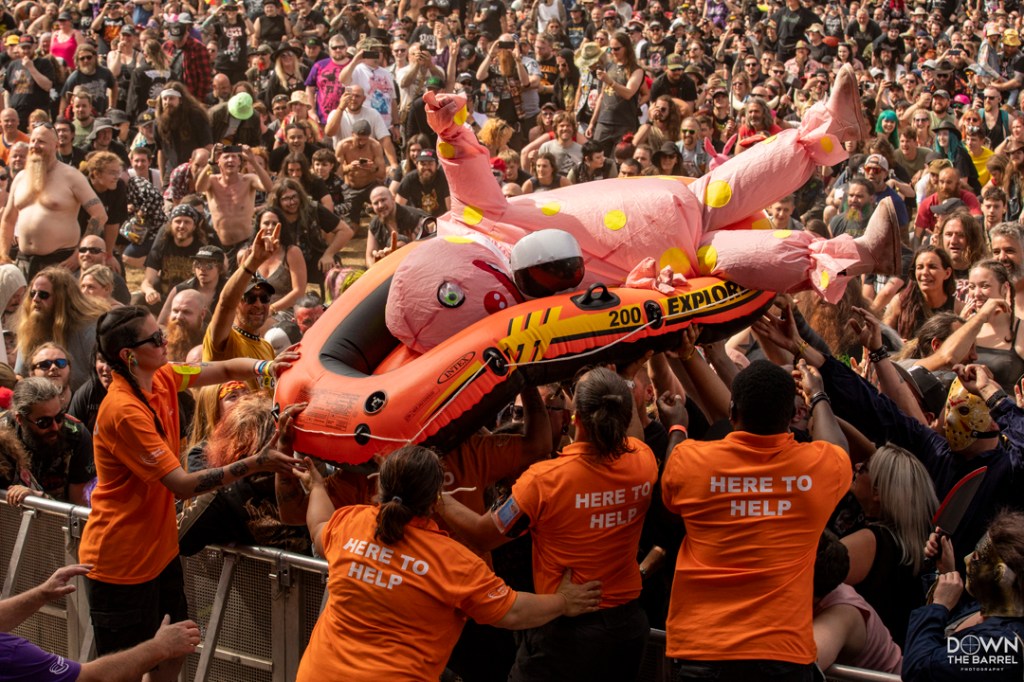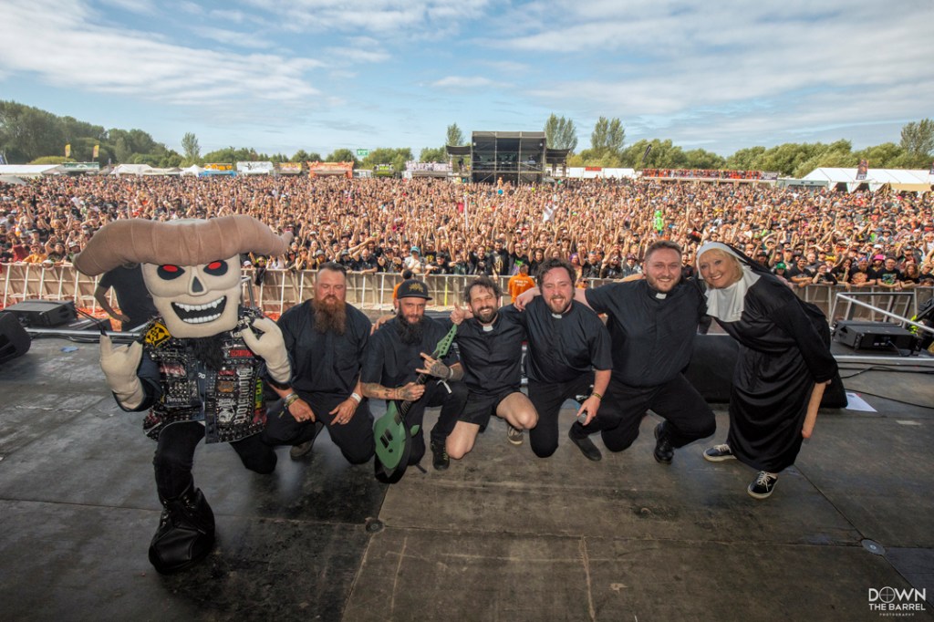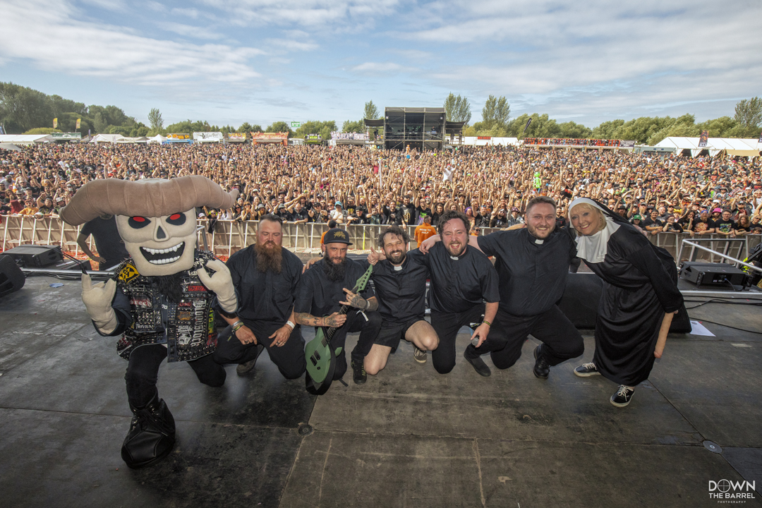 One of my highlights of the festival was an extreme metal band from the depths of Derbyshire, Raised By Owls, who delivered what has to be the most fun and hilarious set of the weekend, with the crowds lapping up their equal parts extreme metal and comedy show with much laughing to be had by all. Some particular prominent moments included vocalist Sam Strachan bringing out his Mum, who was dressed as a Nun, while the rest of the band was dressed as priests. She was so sweet and funny, mocking the band and being comical while rocking out during one of their songs. Another brilliant moment was when Sam announced another special guest, stating, ‘Satan himself…Mr Blobby’ and then Mr Blobby came out looking terrifying and got into a little dinghy boat and crowd surfed on it, which was too funny. They also had a song about Limp Bizkit vocalist Fred Durst, which went down well, and they appropriately ended on a cover of ‘Break Stuff’, which saw everyone kneeling on the ground and jumping up when commanded. It was a fantastic set and turnout for the first main stage band on a Sunday, and it was one that undoubtedly everyone would be talking about after an amusingly brilliant spectacle.