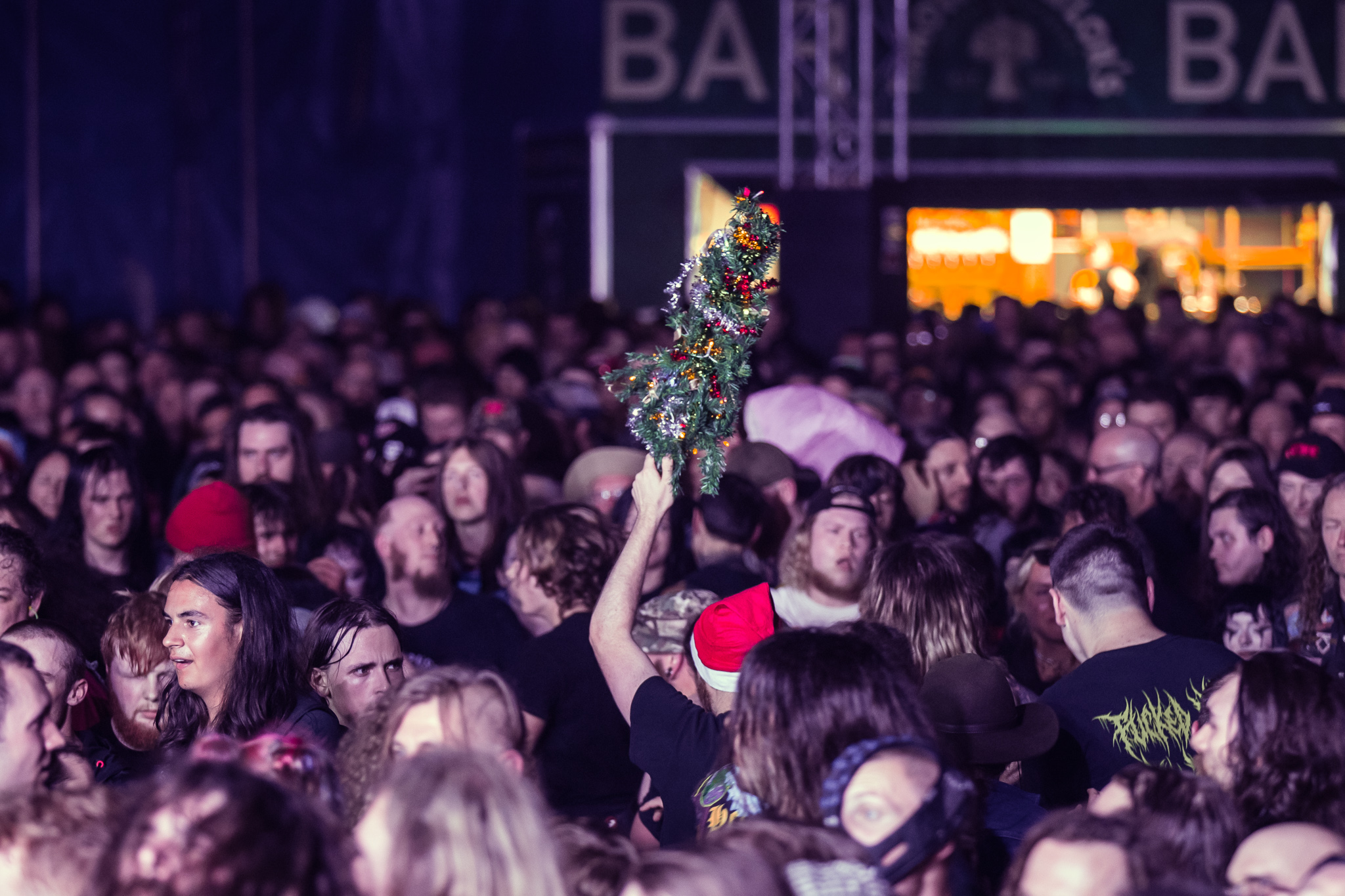One-man speed/black metal act Hellripper, formed by James McBain, delivered a whirlwind of a set blasting his demonic blackened thrash sound to a packed tent, ripping loose with ‘All Hail The Goat’ and further in, playing the deadly ‘From Hell’ as well as a couple from their latest critically acclaimed album, ‘Warlocks Grim & Withered Hags’ such as the popular offerings ‘The Nuckelavee’ and the lively ‘Goat Vomit Nightmare’. Of all the things you would expect to see at a black metal show, a mini Christmas tree with lights on wasn’t one, but it made a prominent focus throughout, to the delight of frontman James, who used it as a way to gauge how chaotic the mosh pit was by tracking it. What a brilliant, crushing set! It showed that we can expect more Hellripper rampaging in the metal ranks.