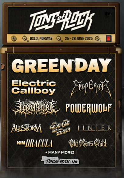 Booking manger Jarle Kvåle comments: “We are extremely proud to announce such a wild and massive first wave of bands for Tons of Rock 2025. Green Day is a dream booking that have been on the top of the wish list from our audience for many years. Seeing next year’s lineup also take shape with incredible acts such as Powerwolf and Lorna Shore, exclusive concerts featuring national treasures like Emperor and Norway’s best and most vital band, The Good, The Bad & The Zugly, along with modern sensations like Electric Callboy and Kim Dracula, is just incredible.”