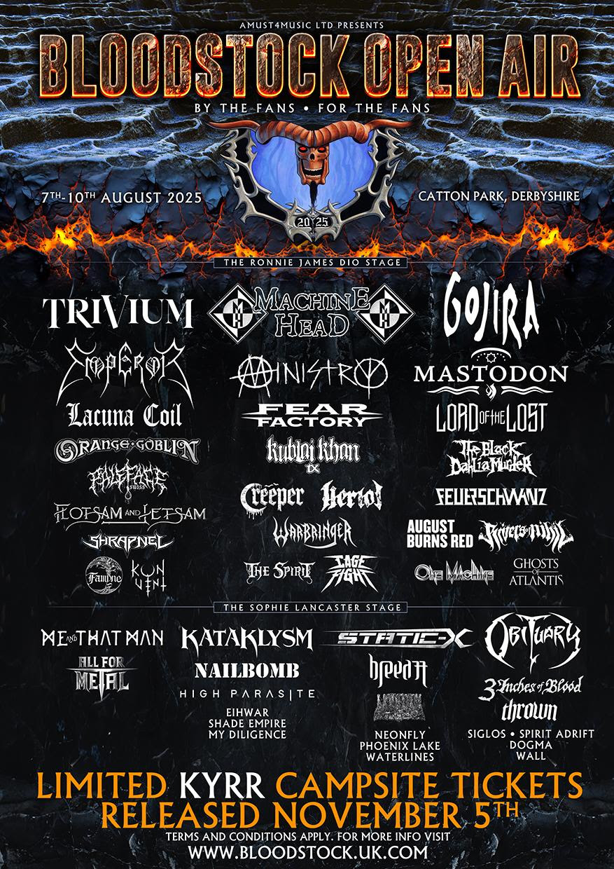 BLOODSTOCK’s 2025 Ronnie James Dio stage headliners are TRIVIUM, MACHINE HEAD, and GOJIRA. Headlining the Sophie Lancaster stage will be ME AND THAT MAN, KATAKLYSM, STATIC-X, and OBITUARY. You’ll also be able to see MASTODON, NAILBOMB, MINISTRY, EMPEROR, FEAR FACTORY, LACUNA COIL, HERIOT, ORANGE GOBLIN, CREEPER, KUBLAI KHAN TX, CAGE FIGHT, RIVERS OF NIHIL, FLOTSAM & JETSAM, THE BLACK DAHLIA MURDER, FEUERSCHWANZ, LORD OF THE LOST, PALEFACE SWISS, AUGUST BURNS RED, WARBRINGER, UNDEATH, SPIRIT ADRIFT, THROWN, ALL FOR METAL, BREED 77, HIGH PARASITE, and 3 INCHES OF BLOOD.