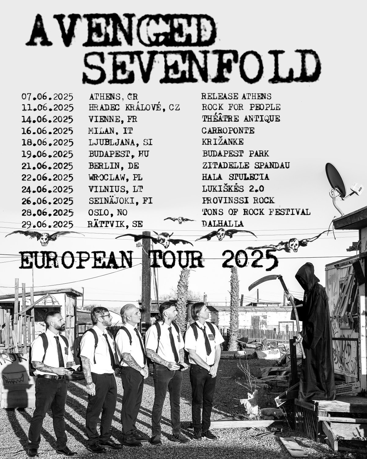 M. Shadows, Synyster Gates, Zacky Vengeance, Brooks Wackerman, and Johnny Christ) have just announced European dates for 2025. Visiting new markets like Lithuania, Slovenia, and Greece the band will be surprising fans with their setlists and production. The band have just played in India for the first time and hopes to visit more unchartered (for them) territories.