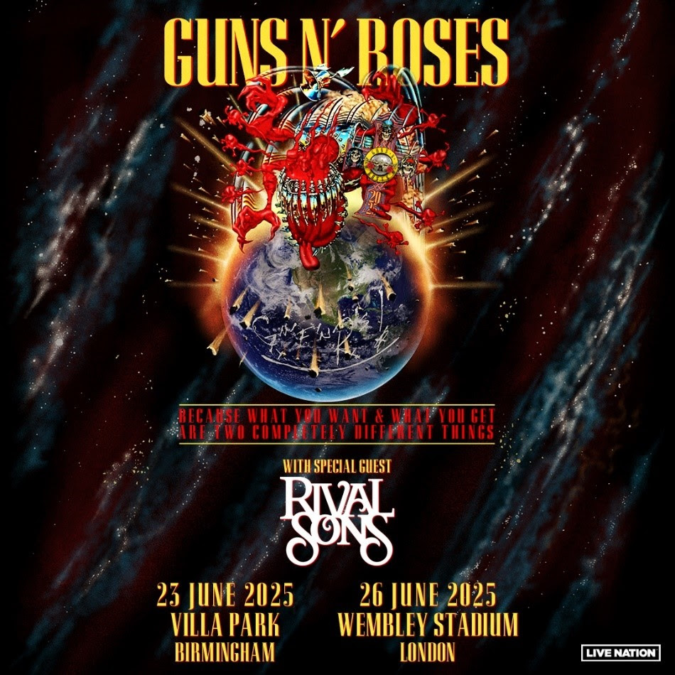 Today, Guns N’ Roses announced they will return to the road on a massive 2025 European and Middle East Tour, headlining stadiums and festivals throughout the summer with special guests Public Enemy, Rival Sons and Sex Pistols featuring Frank Carter on select dates. Kicking off on 23rd May, the 24 date tour will see the LA legends perform in Saudi Arabia, Georgia, Lithuania and Luxembourg for the first time. The 2025 dates also see the powerhouse rock band return to familiar stages in Bulgaria, Serbia, Turkey, Portugal, Spain, Italy, Czech Republic, Germany, UK, Denmark, Norway, Sweden, Finland, Poland, Hungary and Austria. For full tour schedule see below.