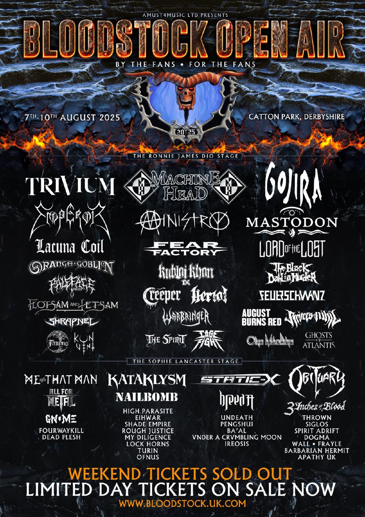 BLOODSTOCK’s 2025 Ronnie James Dio stage headliners are TRIVIUM, MACHINE HEAD, and GOJIRA. Headlining the Sophie Lancaster stage will be ME AND THAT MAN, KATAKLYSM, STATIC-X, and OBITUARY. You’ll also be able to see MASTODON, NAILBOMB, MINISTRY, EMPEROR, FEAR FACTORY, LACUNA COIL, HERIOT, ORANGE GOBLIN, CREEPER, KUBLAI KHAN TX, CAGE FIGHT, RIVERS OF NIHIL, FLOTSAM & JETSAM, THE BLACK DAHLIA MURDER, FEUERSCHWANZ, LORD OF THE LOST, PALEFACE SWISS, AUGUST BURNS RED, WARBRINGER, UNDEATH, SPIRIT ADRIFT, THROWN, ALL FOR METAL, BREED 77, HIGH PARASITE, and 3 INCHES OF BLOOD. Joining them are SHRAPNEL, FAMYNE, KONVENT, THE SPIRIT, GHOSTS OF ATLANTIS, ONE MACHINE, MY DILIGENCE, SHADE EMPIRE, EIHWAR, WATERLINES, PHOENIX LAKE, NEONFLY, WALL, DOGMA, and SIGLOS.