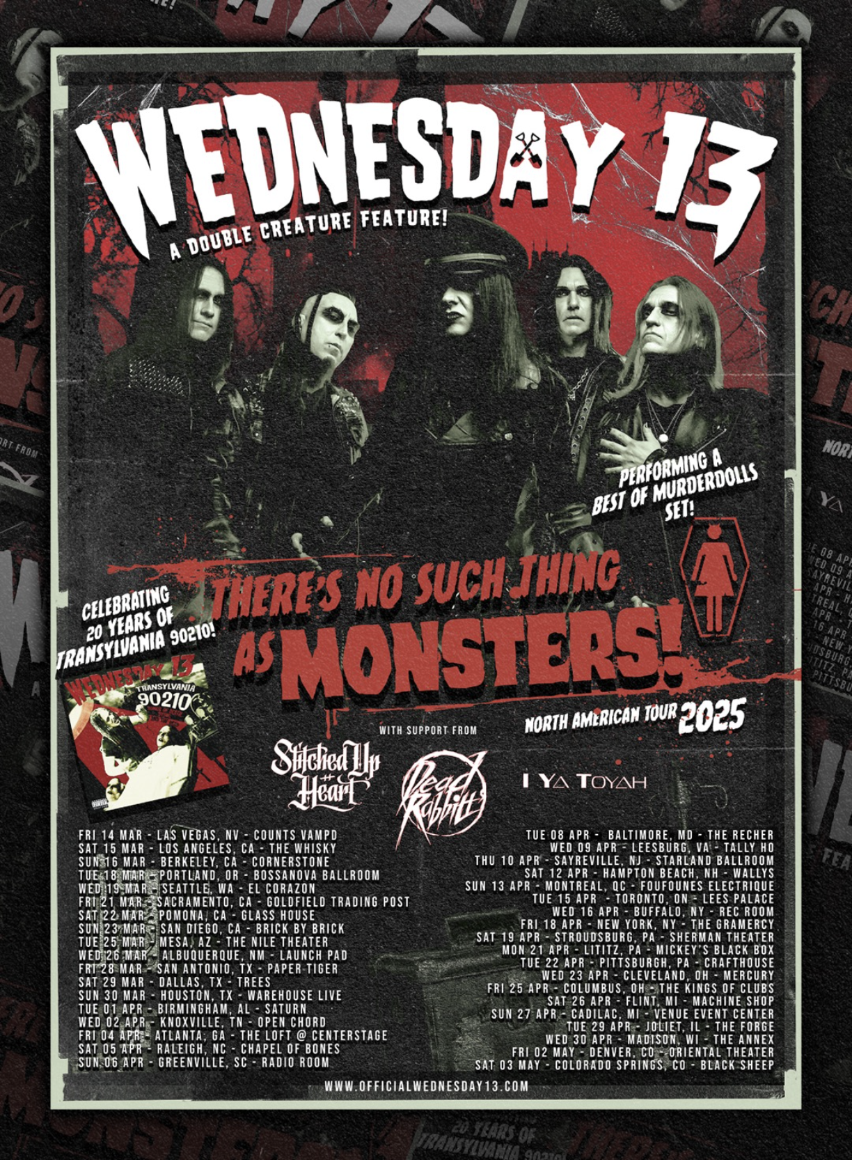 The North American “There’s No Such Thing As Monsters” tour kicks off Friday, March 14 in Las Vegas, NV. The tour celebrates 20 years of Transylvania 90210 and will include a “best of” Murderdolls set!