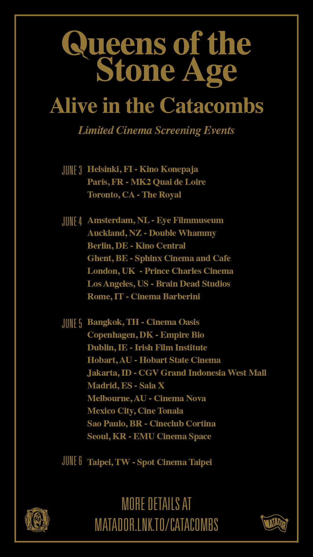 The screenings will also include a preview of an intimate behind the scenes documentary film, revealing the emotional and physical trials Queens of the Stone Age overcame to create Alive in the Catacombs.