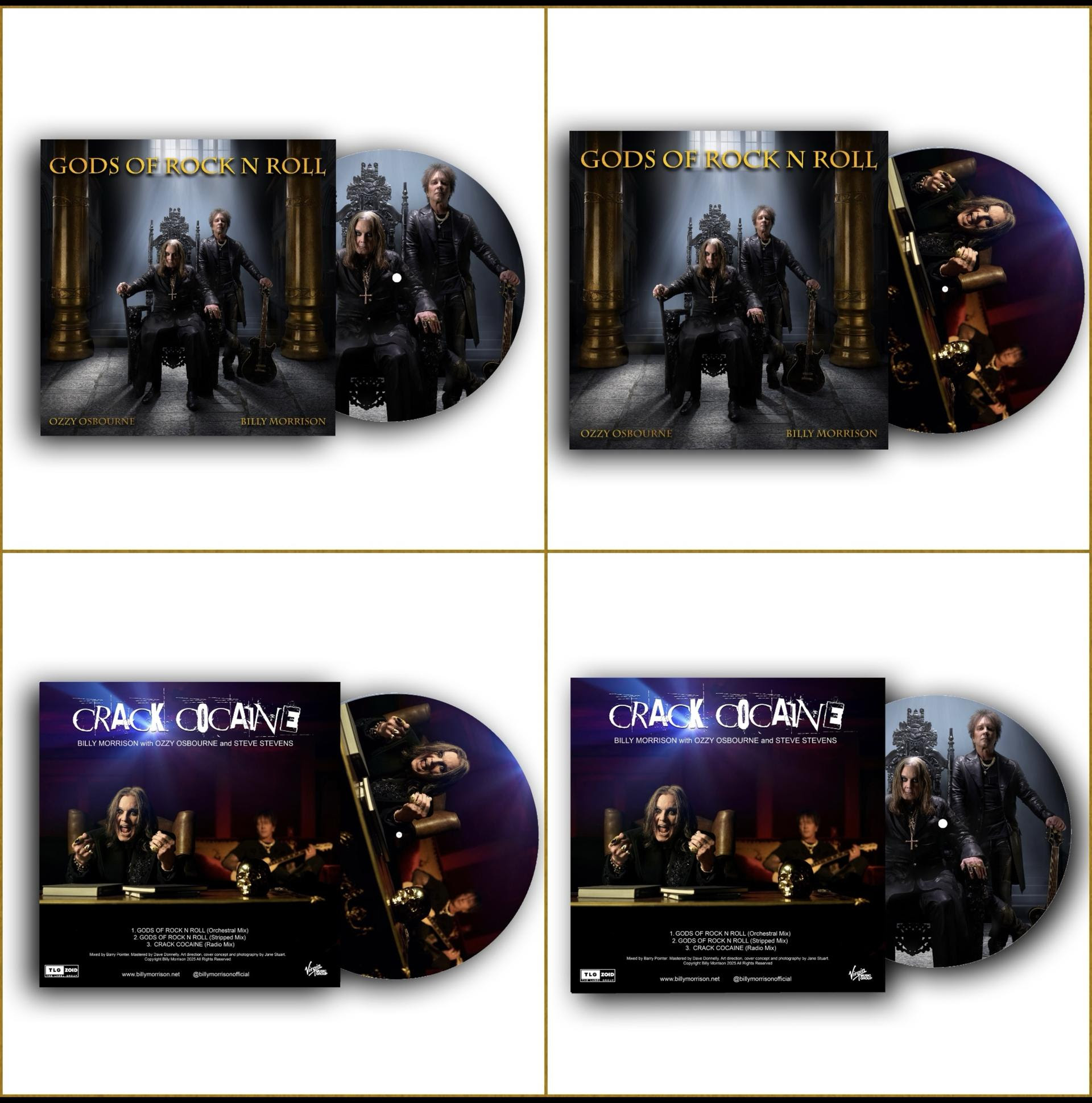 Billy Morrison shares: “I feel so incredibly fortunate to have been able to work with my best friend on those last two songs, CRACK COCAINE and GODS OF ROCK N ROLL, that when the idea of a picture disc vinyl with all the versions on it came up, thanks to my guys at TLG |ZOID, I jumped at the idea. We already had the wonderful cover shots that our photographer, Jane Stuart, had taken throughout the process of both releases, and I remember as a kid just loving the idea of a vinyl record with images on the actual vinyl! It was a no brainer, and a truly wonderful way to close out that chapter with a tip of the hat to Ozzy and the two amazing songs that we did together. I will always be able to watch that video of GODS, when Steve Stevens and I are belly laughing with Ozzy in the studio and hold that close as a treasured memory.”