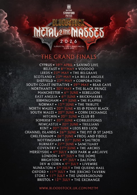 Are you ready for the battle to end all battles (dinosaurs optional)?! Presented by Westons Stowford Press, the METAL 2 THE MASSES grand finals start in Cyprus on April 19th and roll through 30 locations across England, Wales, Scotland, Northern Ireland, Channel Islands, Norway, as well as Cyprus! Every winner will perform a 30 minute slot on the Stowford Press New Blood Stage! Round up your mates and get along to your local night – help shape the line-up of the festival and support grassroots venues and bands.